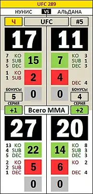 - 1 2 Результаты и бонусы UFC 289: Нунес vs Алдана | UFC. ufc.ru (10 июня 2023). Дата обращения: 11 июня 2023. Архивировано 11 июня 2023 года.