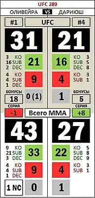 - ↑ UFC 289 bonuses: Charles Oliveira's statement first-round finish earns $50,000 (амер. англ.). MMA Junkie (11 июня 2023). Дата обращения: 11 июня 2023. Архивировано 11 июня 2023 года.