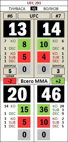 | 11 | Полулёгкий вес | 13-7 | 2-4 | -3 | vs. | 16-6 | 0-1 | -1 | [15] | ||||