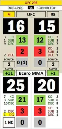 - 1 2 Результаты и бонусы UFC 296: Эдвардс vs Ковингтон | UFC. www.ufc.ru (16 декабря 2023). Дата обращения: 17 декабря 2023. Архивировано 17 декабря 2023 года.