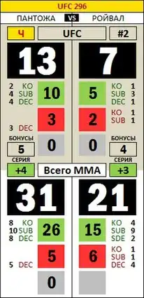 | 1 | Полусредний вес | Ч | 21-3 (1) | 13-2 (1) | +11 | vs. | #3, exВЧ, exП | 17-3 | 12-3 | +1 | [5] | ||