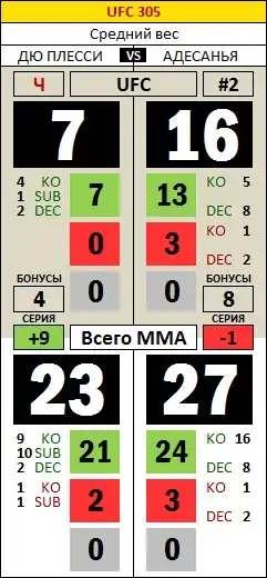 | 1Р | 2Р | 3Р | Голова | Корпус | Ноги | Дистанция | Клинч | Партер | ||||||||