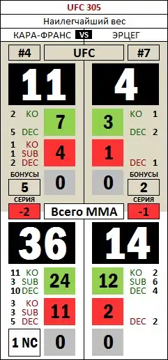 | 11 | Полусредний вес | 21-8 | 5-4 | -1 | vs. | 22-8-2 | 4-5-1 | -2 | [13] | ||||
