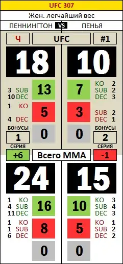 - ↑ UFC 307 results: Julianna Peña claims gold again in controversial decision over Raquel Pennington (амер. англ.). MMA Junkie (6 октября 2024). Дата обращения: 6 октября 2024. Архивировано 7 октября 2024 года.