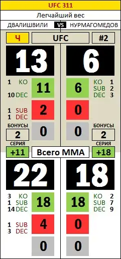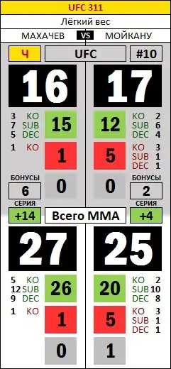 | Ислам Махачев | 0 | 6/9 | 31% | 6/19 | - | - | - | - | 5/17 | 1/2 | - | 5/18 | - | 1/1 | 1/2 | 50% | 1:27 | 1 |