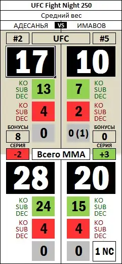 | 1Р | 2Р | 3Р | 4Р | 5Р | Голова | Корпус | Ноги | Дистанция | Клинч | Партер | ||||||||
