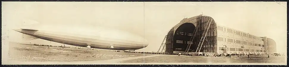 ![]() Швартовка дирижабля «Лос-Анджелес» на палубе авианосца «Саратога» 27 января 1928 года | |