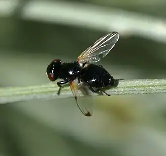 Блестяще чёрные мухи с чёрной, красноватой и желтоватой головой. Лоб часто ямчатый. Орбиты иногда покрыты белыми микротрихиями. Усиковые борозды глубокие, разделены отчетливым лицевыми килем. Щёки короче половины высоты глаз. Первый членик усиков округлый или овальный, коричневой, чёрной, оранжевой или жёлтой окраски. Крылья прозрачные, на вершине с темным пятном. Ноги преимущественно коричневые или черные. Щиток блестящий c редкими короткими желтоватыми щетинками, но без микротрихий как у рода Timia. Брюшко обычно блестящее, реже матовое, иногда покрыто белыми микротрихиями[1][2].
