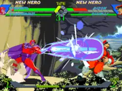 Кроме того, из-за ограничений памяти PlayStation, как графика, так и геймплей порта были изменены[16]. Например, чтобы уменьшить объём использования оперативной памяти, были упрощены анимации[16][17]. Также был убран командный бой[18]. Вместо того, чтобы переключаться между персонажами по желанию, второй персонаж вступает в игру только во время определённых комбо-атак[16][18]. Версия для PlayStation включает в себя код, который позволяет игрокам соревноваться в «псевдо-командных матчах», при условии, что каждый игрок использует основного персонажа своего противника в качестве своего напарника[16]. Например, если первый игрок контролирует Рю, а второй — Росомаху, то напарником первого будет Росомаха, а второго — Рю.