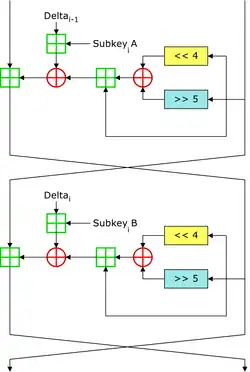 В работе XTEA применяются следующие логические операции: исключающее «ИЛИ», битовый сдвиг и логическое «И». Кроме того в XTEA используется операция сложения целых чисел по модулю 232, обозначающаяся как x y (x и y Z232). Исключающее «ИЛИ» в булевой логике обозначается как x y, а в языке Си как x ^ y. Логическое «И» в булевой логике — x y в языке Си — x & y. Логический сдвиг x на y бит влево обозначается как x y, а логический сдвиг x на y бит вправо обозначается как x y. Пусть на вход n-го (1 ≤ n ≤ 64) раунда алгоритма подается (Ln,Rn), а на выходе получается (Ln+1,Rn+1), причем Ln+1 = Rn. Rn+1 вычисляется следующим образом: