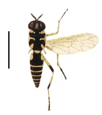 Тело имаго тёмное длиной 8,0—15,0 мм. На среднеспинке и брюшке имеются жёлтые и рыжие пятна и полосы. Бёдра задних ног не утолщены и снизу без шипиков. Щупики состоят из одного членика. Вдоль основания первого тергита брюшка идёт узкая светлая полоса[1][2].