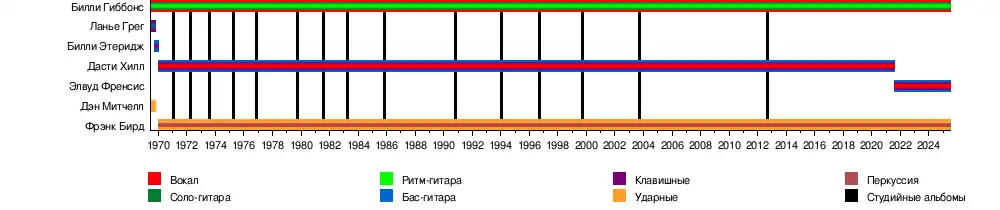 Состав группы оставался практически неизменным со дня основания до смерти бас-гитариста в 2021 году: Билли Гиббонс (гитара, вокал), Дасти Хилл (бас-гитара, вокал), Фрэнк Бирд (ударные). Продюсером с основания группы и вплоть до сентября 2006 года был Билл Хэм.