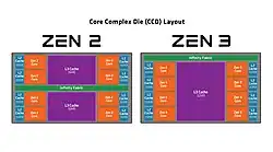 Как и Zen 2, Zen 3 состоит из двух комплексных матриц ядра (CCD) и отдельной матрицы ввода-вывода, содержащей компоненты ввода-вывода. Zen 3 CCD состоит из одного комплекса ядер (CCX), содержащего 8 ядер CPU и 32 МБ общей кэш-памяти L3, в отличие от Zen 2, где каждый CCD состоит из двух CCX, каждый из которых содержит 4 ядра, а также 16 МБ кэш-памяти L3. Новая конфигурация позволяет всем 8 ядрам CCX напрямую взаимодействовать друг с другом и с кэшем L3 вместо того, чтобы использовать матрицу ввода-вывода через Infinity Fabric.