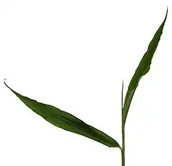Листья очерёдные простые, цельные, ланцетовидные цельнокрайные, с заострённой верхушкой, имеют листовое влагалище. Основание листа сердцевидное.