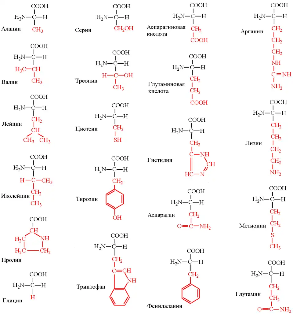Структурные формулы 20 протеиногенных аминокислот обычно приводят в виде так называемой таблицы протеиногенных аминокислот: