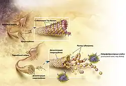 3) Тау-гипотеза: Наряду с амилоидной гипотезой изучается тау-гипотеза, согласно которой каскад нарушений запускается отклонениями в структуре тау-белка[69]. Предположительно, нити гиперфосфорилированного тау-белка начинают объединяться между собой, образуя в итоге нейрофибриллярные клубки внутри нервных клеток[81]. Это вызывает дезинтеграцию микротрубочек и коллапс транспортной системы внутри нейрона[82], приводя сначала к нарушению биохимической передачи сигналов между клетками, а затем и к гибели самих клеток[83].
