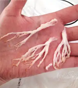 Пластический бронхит, также известный как фибринозный или псевдомембранозный[85], является редким пульмонологическим заболеванием[86] и характеризуется формированием в бронхах слепков, по консистенции напоминающих резину[84], которые отхаркиваются или обнаруживаются в дыхательных путях при бронхоскопии или хирургической операции[85]. Заболевание известно на протяжении тысячелетий и может оказаться более распространённым, чем сообщается, поскольку многие врачи не знакомы с ним и могут не распознать случаи с лёгким течением[86]. Слепки могут возникать в любой части трахеобронхиального дерева[87]. По форме слепки обычно цилиндрические, похожие на спагетти или макароны, могут разветвляться, а по цвету — бледно-серые или зеленовато-белые, при наличии же крови приобретают коричневый цвет[86].