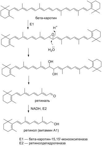 β-Каротин сначала расщепляется 15-15'-монооксигеназой в центральной части молекулы с образованием ретиналя, а затем — редуктазой с участием коферментов NADH и NADPH. Одновременный приём с пищей антиоксидантов препятствует окислению каротина по периферическим двойным связям. Витамин B12, повышает активность монооксигеназы. Это увеличивает количество молекул каротина, которые расщепляются по центральной связи, и эффективность синтеза витамина A увеличивается в 1,5—2 раза[2].