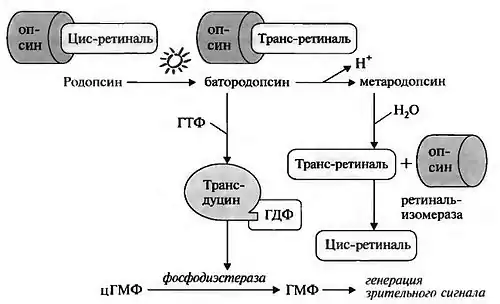 - Падение внутриклеточной концентрации цГМФ вызывает каскад событий, приводящий к генерации зрительного сигнала: перекрытие цГМФ-зависимых Na+ и Ca2+ каналов → деполяризация мембраны → возникновение нервного импульса → преобразование импульса в зрительное восприятие в мозге.