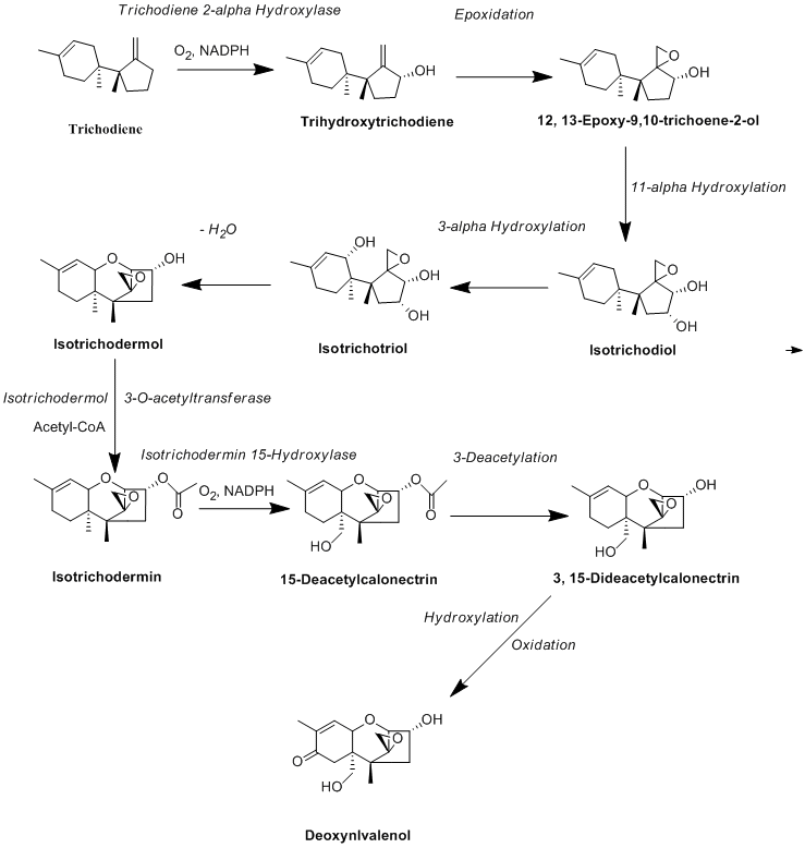 Благодаря своей растворимости в воде и стабильности при нагревании (температурах до 120°C), условиях хранения и процессах помола, ДОН заражает зерновые культуры и в значительной степени остаётся неизменным в процессе производства. Таким образом, он также может быть найден в продуктах на основе злаков, включая завтраки из злаков, хлеб, кондитерские изделия, пиво, детские смеси и детское питание [4].