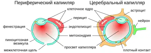 Капиллярные сосуды выстланы эндотелиальными клетками. Эндотелий сосудов большинства тканей содержит открытые промежутки (фенестра́ции) диаметром около 50 нм и межклеточные щели от 100 до 1000 нм. Через эти промежутки вода и растворённые в ней вещества циркулируют между кровью и межклеточным пространством. Отличительной особенностью сосудов центральной нервной системы является отсутствие как фенестраций, так и межклеточных щелей между эндотелиальными клетками[30]. Таким образом, эндотелиальная выстилка капилляров мозга является сплошной[31].