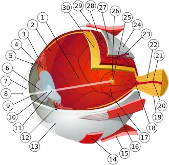 Глаз (лат. oculus) — сенсорный орган (орган зрительной системы) животных, обладающий способностью воспринимать электромагнитное излучение в видимом диапазоне длин волн и обеспечивающий сенсорную функцию зрения. У человека через глаз поступает около 90 % информации из окружающего мира[1].