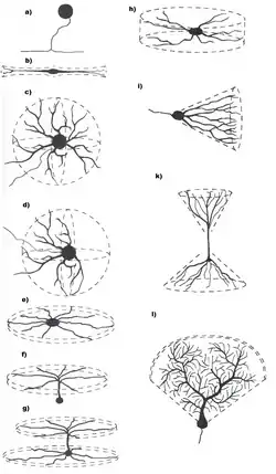 Одна из принятых, но и самых тяжёлых, в нейробиологии классификаций нейронов (основана Кахалем) основывается на их дендритной структуре и плотности. Однако, с другой стороны, есть нейроны, которые не имеют дендритов («адендритные нейроны»), а только разветвлённые аксоны (напр., нейроны дорсального корешкового ганглия и симпатического ганглия); есть нейроны со слишком сложными дендритами. К нейронным типам с наиболее характерными дендритными формами относятся[1]: