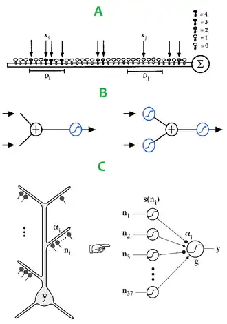 Дендриты, следовательно, являются электрически распределенными «механизмами», поэтому нейроны не являются эквипотенциальными — как их моделировали в классических теориях, — ибо между различными регионами дендритного дерева (и сомы) может существовать десятикратная разница напряжений как результат локального синаптического входа в дендриты.
