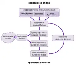 В современных исследованиях механизмов восприятия письменного текста одним из ключевых является вопрос о том, как происходит лексический доступ, в том числе как задействованы в этом графическая и фонологическая репрезентации слова. Основными принятыми теориями на данный момент являются сильная фонологическая теория Фроста (англ. Frost)[25] и модель двойного маршрута чтения Колтхарта (англ. Coltheart)[26]. Согласно теории Фроста, фонологическое декодирование, то есть перевод графем в фонемы при чтении, в том числе при чтении про себя, является базовой высокоавтоматизированной когнитивной операцией, которая происходит всегда, поскольку значения слов при овладении родным языком усваиваются в первую очередь в ассоциации с их звуковым обликом. С другой стороны, идея двойного маршрута Колтхарта заключается в наличии двух независимых путей обработки письменного текста: первый основан на перекодировании графического облика слова в звуковой (print-to-sound) с дальнейшим осуществлением доступа к семантике с опорой на звуковой облик, второй же путь предполагает доступ к семантике слова непосредственно с опорой на графический облик (print-to-meaning). Подробнее см. Виды дислексии[27].