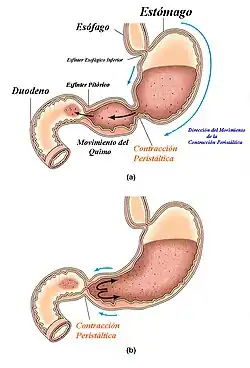 За счёт мышечного слоя желудок перемешивает пищу и желудочный сок, образуя химус — жидкую кашицу, которая удаляется отдельными порциями из желудка через привратниковый канал. В зависимости от консистенции поступившей пищи, она задерживается в желудке от 20 минут (фруктовые соки, а также овощные соки и бульоны) до 6 часов (свинина).