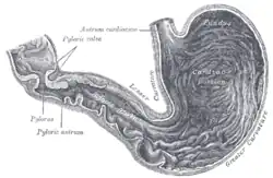 Правая суженная часть желудка носит название пилорической (лат. pars pylorica). В её составе выделяют более широкую часть, называемую привратниковой пещерой (лат. antrum pyloricum) и более узкую — канал привратника (лат. canalis pyloricus). Последний переходит в двенадцатиперстную кишку. Границей между желудком и двенадцатиперстной кишкой считается круговая борозда — привратник (лат. piloros), который соответствует отверстию канала привратника. Он снабжен сфинктером (кольцевой мышцей). Желудок человека имеет две стенки: переднюю (лат. paries anterior), являющуюся обращенной вперёд, несколько вверх и вправо, и заднюю (лат. paries posterior), обращенную назад, вниз и влево. Передняя и задняя стенки переходят одна в другую по большой и малой кривизне желудка.