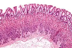 Мышечная пластинка СО — образована тремя слоями гладкомышечных клеток (внутренним косым, наружным продольным и средним круговым). От неё в промежутки между железами направляются тонкие пучки гладкомышечных клеток[7].