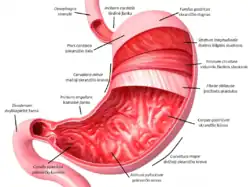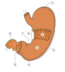 В желудке выделяют входную — кардиальную часть (лат. pars cardiaca), слева от которой желудок расширяется, образуя дно (свод) желудка (лат. fundus (fornix) ventriculi), который далее книзу и вправо переходит непосредственно в тело желудка (corpus ventriculi). Левый (нижний) выпуклый край желудка образует собой большую кривизну (curvatura major), а правый вогнутый верхний формирует малую кривизну (лат. curvatura minor). В верхней левой части малой кривизны находится кардиальное отверстие (лат. ostium cardiacum) — место перехода пищевода в желудок.