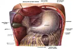- Желудочно-диафрагмальная связка (лат. lig. gastrophrenicum) переходит с диафрагмы на дно желудка.
