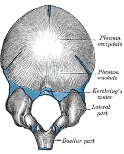- Окципут — вся остальная кость ниже верхней выйной линии, имеет хрящевое происхождение с шестью точками окостенения. Состоит из супраокципута (чешуя ниже верхней выйной линии) с двумя ядрами окостенения, инфраокципута (мыщелки и основание кости) с четырьмя ядрами окостенения. На уровне канала подъязычного нерва мыщелки разделены на переднюю 1/3 и задние 2/3. На границе супра- и инфраокципутов проходит т.н шарнир Будена - ничто иное как задний интраокципитальный синхондроз - хрящевое соединение чешуи затылочной кости с ее латеральными частями.
