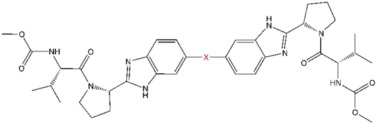 Первый ингибитор белка NS5A, который получил одобрение FDA в 2015 году, был даклатасвир[13]. Другие препараты были одобрены, среди них, в частности, ледипасвир, который, наряду с софосбувиром, входят в состав препарата Harvoni[14][15].