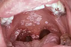 Хронический бляшечный кандидоз полости рта (хронический гиперпластический кандидоз) может проявляться узловатой формой или белыми бляшками на щеке или языке, которые нелегко удалить.[11]