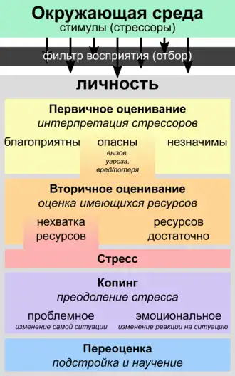 Как показано Лазарусом[4], стресс — это дискомфорт, испытываемый человеком для эффективного реагирования на вызовы среды, при индивидуальном восприятии им недостаточности имеющихся и доступных ему ресурсов. Именно индивид оценивает ситуацию как стрессовую или нет. По Лазарусу и Фолкман, индивиды оценивают для себя величину потенциального стрессора, сопоставляя запросы среды с собственной оценкой ресурсов, которыми они владеют, чтобы справиться с этими самыми запросами[5].
