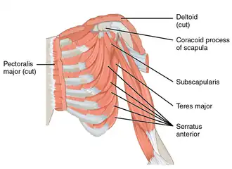 Коракоидный отросток пальпируется чуть ниже бокового конца ключицы. Он также известен как «маяк хирурга», потому что он служит ориентиром, позволяющим избежать повреждения сосудов и нервов.[3] Основные сосудисто-нервные структуры входят в верхнюю конечность медиально к коракоидному отростку, так что хирургические доступы к области плеча всегда должны происходить латерально к нему.