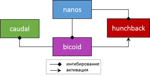 мРНК bicoid и nanos синтезируются питающими клетками фолликула и транспортируются в ооцит. Белок nanos- регулятор трансляции. Он связывается с 3’OH нетранслируемым участком мРНК hunchback и bicoid и вызывает её деградацию. Разрушение мРНК hunchback в задней части зародыша приводит к созданию передне-заднего градиента белка hunchback, что позволяет экспрессироваться генам knirps, kruppel и giant, отвечающих за спецификацию брюшного отдела, в средней части зародыша. При потере функции nanos у мутанта полностью отсутствуют абдоминальные сегменты. За связывание белка nanos с мРНК отвечает белок — продукт гена pumilio.
