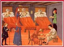 Берестяные грамоты начала XIV в. сообщают о наличии монастырских больниц в древнем Новгороде. В первой половине XVI в. основана больница при Соловецком монастыре. При ней была специальная больничная библиотека. Монахи занимались не только практической медициной, перепиской и хранением рукописей, но и переводом греческих и латинских книг медицинского содержания. Так в начале XV в. в Кирилло-Белозерском монастыре, на территории которого располагались больничные палаты, его основатель монах Кирилл Белозерский (1337—1427) перевёл с греческого небольшой рукописный трактат «Галиново на Иппократа» — комментарии Галена на сочинение одного из врачей школы Гиппократа, получивший затем широкое распространение[16], а в XVII век монах Чудова монастыря Епифаний Славинецкий перевёл на русский язык сокращенный труд Андреаса Везалия по научной анатомии «Эпитоме»[17]. При этом они дополняли их своими знаниями, основанными на опыте русского народного врачевания[16].