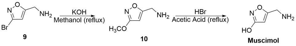 (9) затем кипятили с гидроксидом калия в метаноле с образованием 5-аминометил-3-метоксиизоксазола (10) с выходом 66%. Дальнейшее кипячение (10) с бромоводородной кислотой и уксусной кислотой позволило получить мусцимол с выходом 62%. Общий синтетический выход составил 30%.[47]