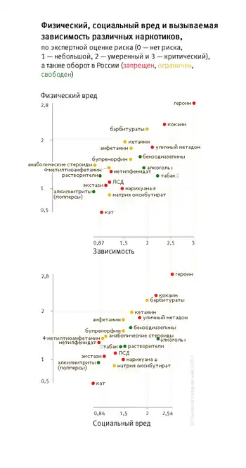 - ↑ По мнению известного британского врача-нарколога Дэвида Натта, из наиболее распространенных наркотиков наибольший вред здоровью потребителя наносят (по убывающей) героин, крэк и метамфетамин. Однако социальный вред распределен по-другому: опаснее всего алкоголь, затем идут героин и крэк[13]
