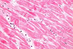 - Гиперэозинофилия цитоплазмы на образцах с гематоксилином и эозином.[17] Он виден как более темное пятно цитоплазмы.
