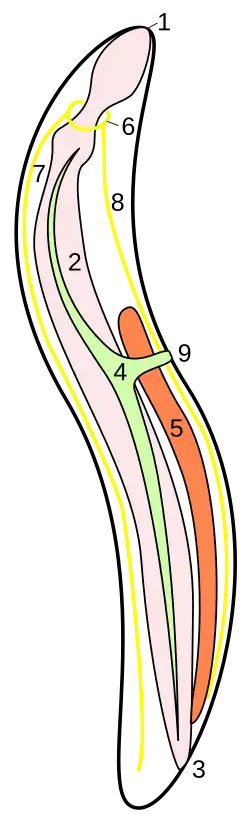 1 — передний конец тела, несущий рот; 2 — кишка; 3 — клоака; 4 — выделительная система; 5 — семенник; 6 — нервное кольцо; 7 — дорсальный нерв; 8 — вентральный нервный ствол; 9 — выделительное отверстие