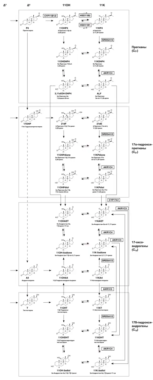 Обходные пути к 11-оксоандрогенам и 11-гидроксиандрогенам могут быть в целом представлены двумя точками входа Δ4 стероидов (17OHP и прогестерон), которые могут претерпевать общую последовательность из трёх преобразований: