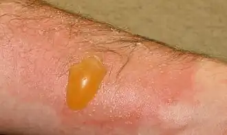 • Везикула. Пузырёк с серозным или геморрагическим содержимым. Возникает в результате отслоения верхнего слоя эпидермиса и заполнения промежутка лимфой или кровью при ожогах 2—3-й степеней. При ожогах 3-й степени везикулы могут сливаться в буллы.