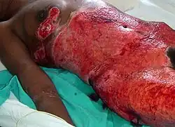 Ожоговая травма — это не только местное повреждение тканей в области действия поражающего агента, но и комплексная реакция организма на полученное повреждение. Последствия ожоговой травмы можно разделить на три большие группы: ожоговая болезнь, синдром эндогенной интоксикации и ожоговая инфекция с ожоговым сепсисом[17].