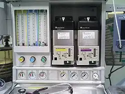 - при отёке лёгких, что сопровождается выделением пенистой жидкости из дыхательных путей, кислородную смесь барботируют через пеногаситель — увлажнение газовоздушной смеси (или кислорода) антифомсиланом[8][9][10] или 50 % раствором этилового спирта.