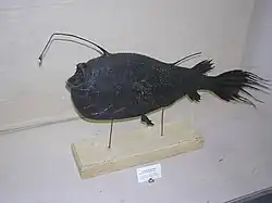 У некоторых семейств рыб-удильщиков (Caulophrynidae, Ceratiidae, Neoceratiidae и Linophrynidae) существуют крайне необычные отношения между полами, не встречающиеся среди других рыб и позвоночных животных: Гренландская цератия (Cryptopsaras holboelli). Самка с крошечным самцом-паразитом. Препарат из Музея зоологии в Санкт-Петербурге. карликовые самцы живут в виде «паразитов» на теле самок. До перехода к паразитизму самцы обладают хорошо развитыми глазами и крупными обонятельными органами. Это позволяет им отыскивать самок по запаху феромонов, следы которого сохраняются в практически неподвижной воде больших глубин долгое время. Приблизившись к самке, самец, видимо, визуально распознает её видовую принадлежность по строению или по цвету и частоте её вспышек. Затем самец прицепляется к боку самки своими острыми зубами. Вскоре он срастается с самкой губами и языком, а его челюсти, зубы, глаза и кишечник редуцируются так, что в конце концов он превращается в простой придаток, вырабатывающий сперму. Питание самца осуществляется за счёт крови самки, так как их кровеносные сосуды тоже срастаются. На одной и той же самке может одновременно паразитировать до трёх самцов. Однажды прикрепившись, они полностью утрачивают самостоятельность. Биологическое значение этого явления, по-видимому, связано с облегчением нахождения полами друг друга во время размножения и с ограниченностью пищи на больших глубинах, и поэтому формально оно не должно рассматриваться как истинный паразитизм, а как специфическая форма социального. Учёные назвали такое поведение «сексуальным паразитизмом»[87].